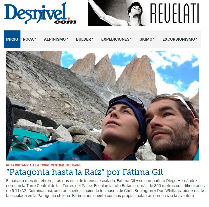 El pasado mes de febrero, tras dos días de intensa escalada, Fátima Gil y su compañero Diego Hernández coronan la Torre Central de las Torres del Paine. Escalan la ruta Británica, más de 800 metros con dificultades de 5.11/A2. Culminan así, un gran sueño, siguiendo los pasos de Chris Bonington y Don Whillans, pioneros de la escalada en la Patagonia chilena. Fátima nos cuenta con sus propias palabras como vivió la aventura.
