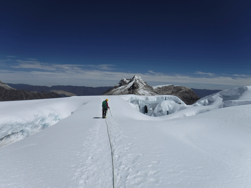 Tocllaraju significa «Nevado con trampas» y aunque vamos siguiendo la huella de los primeros que salieron del campo de altura, tenemos que ir sorteando profundas grietas, que con tan poca luz, tienen un aire siniestro. Son como pozos sin fondo repletos de purpurina. Vamos unidas por una cuerda en este desfile pesado. Y así, sin prisa, pero sobre todo sin pausa, ascendemos el inmenso glaciar.